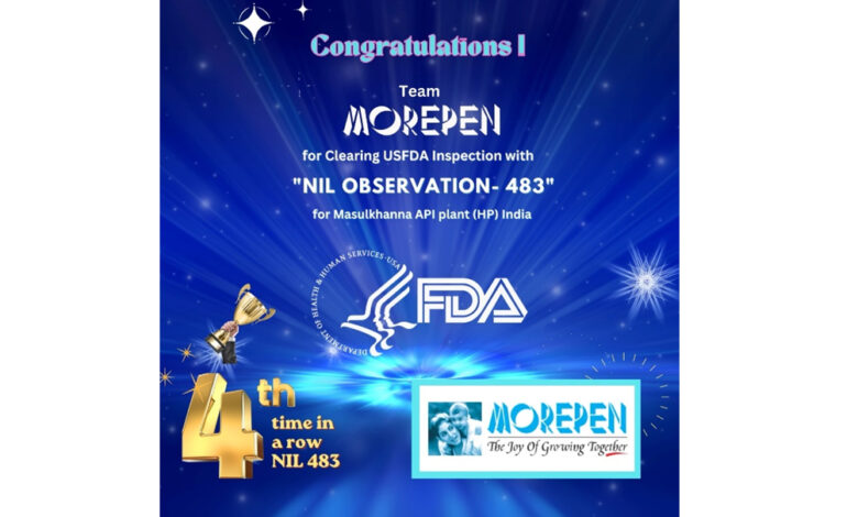 मोरेपेन लैब्स की मैन्युफैक्चरिंग इकाई ने ऐतिहासिक रिकॉर्ड बनाते हुए लगातार चौथी बार यूएसएफडीए निरीक्षण बिना किसी प्रतिकूल टिप्पणी के सफलतापूर्वक पास किया
